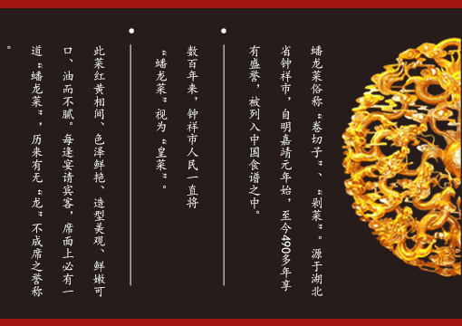 蟠龍菜創(chuàng)于湖廣安陸州(今湖北鐘祥市),鐘祥地區(qū)人們逢年過節(jié)、婚喪嫁娶離不開的傳統(tǒng)名菜,被列入中國(guó)食譜之中,是鐘祥地區(qū)名優(yōu)土特之一。公司多年來保留古法工藝精髓,致力于生產(chǎn)、加工、改進(jìn)蟠龍菜,產(chǎn)品得到市場(chǎng)的一致好評(píng)與肯定。